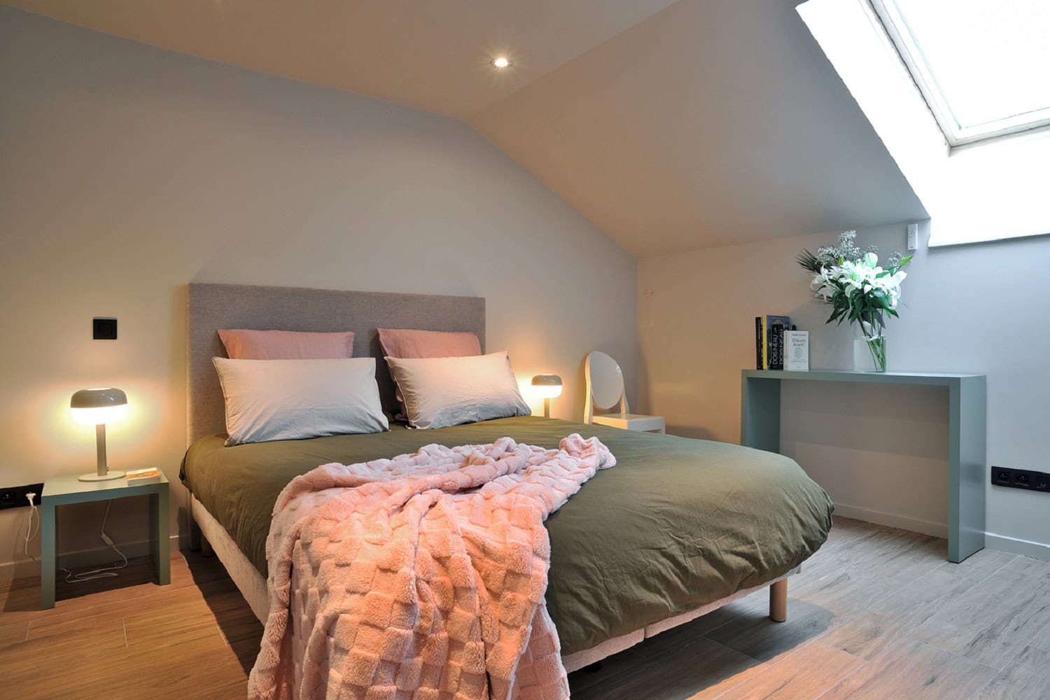 A l'étage, cette chambre double privative, décorée dans des tons très doux, dégage une atmosphère très calme et apaisante. Spacieuse, elle bénéficie d'un accès direct sur le salon et la salle de bain de l'espace commun.